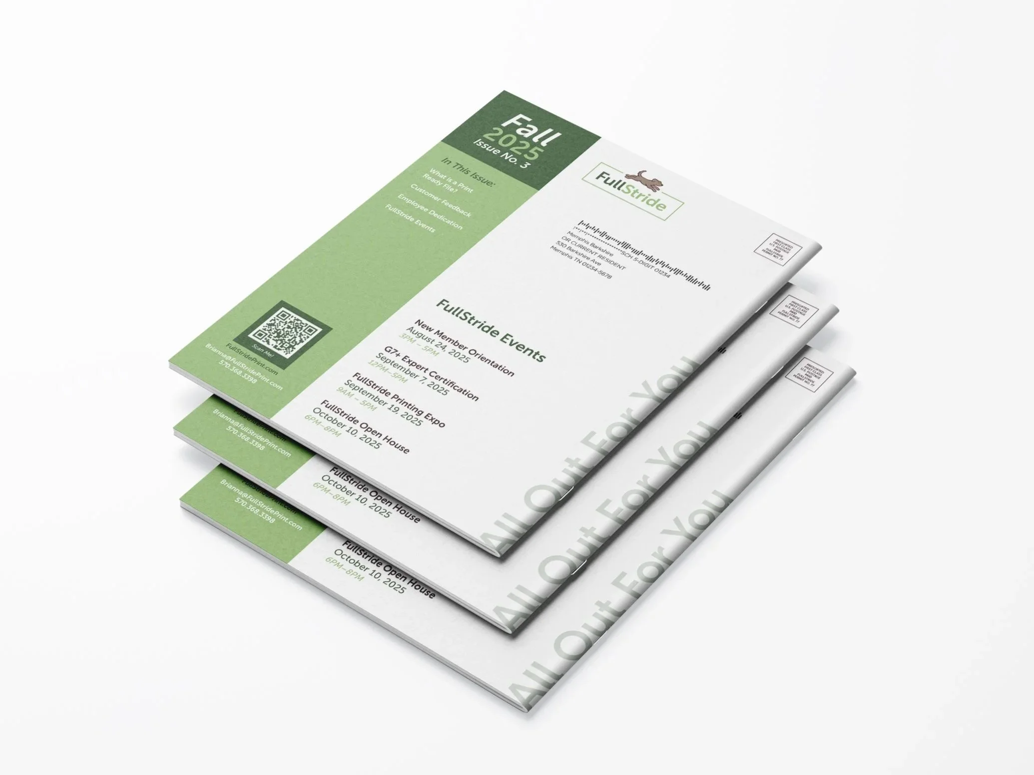 FullStride is your modern print solution company, specializing in consistent, high-quality, personalized print production for small to medium-sized projects. Our team has over 30 years of experience and is built on strong core values, focusing on delivering custom, fast, and cost-effective marketing collateral. By investing in the latest printing technology, we offer flexible solutions that provide you with a seamless experience from start to finish.